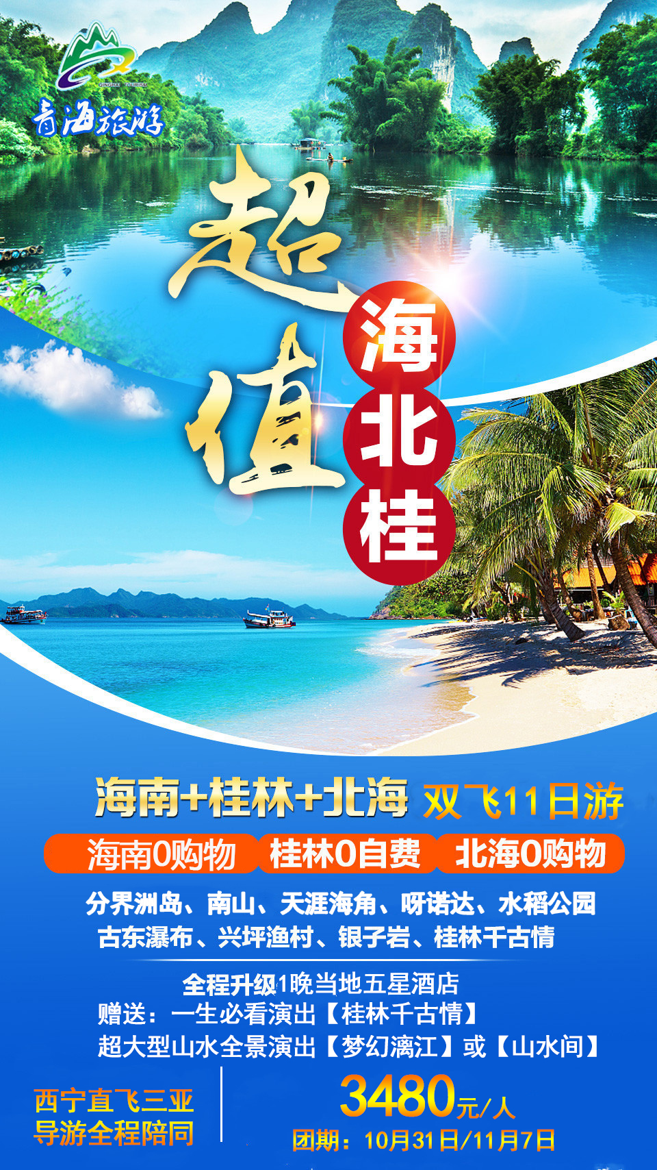 ◆北海一日游 早上接船,早餐后游览北海市容集多种功能一体的【北部湾广场】、【南珠魂城雕】、【大榕树】(约30分钟)。后前往国家AAAA级景点,有着“东方夏威夷之称”的“天下第一滩”——【北海银滩】(约120分钟),银滩以“滩平长,沙细白,水温净,浪柔软,无鲨鱼,坡度缓、无礁石”而著称。海边绿树成荫,空气新鲜,空气中负离子数比一般城市高60—100倍,可治多种疾病,人称这里是免费的氧吧!自费景点推荐:A:环岛游228+恒大赶海280=508元/人优惠价:440元/人 B:渔家乐280+大江埠越南村168=448元/人优惠价:400元 ,晚乘动车至桂林。 |